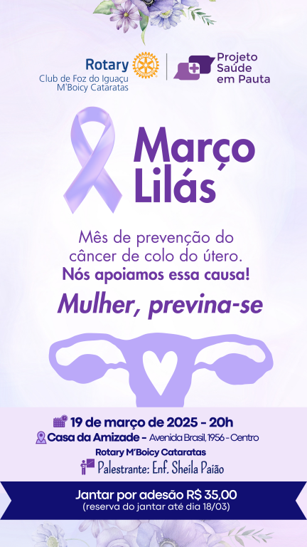 No dia 19 de março, o Rotary Club de Foz do Iguaçu M'Boicy Cataratas, em sua 33ª reunião, realizada na Casa da Amizade, teve honra de receber a primeira palestra do projeto “Saúde em Pauta”, com um tema extremamente relevante: o “Maio Lilás”, mês de conscientização sobre o câncer de colo de útero. A palestra foi conduzida com maestria pela enfermeira Sheila Rodrigues Paião, que trouxe informações valiosas e dicas essenciais para a prevenção dessa doença.