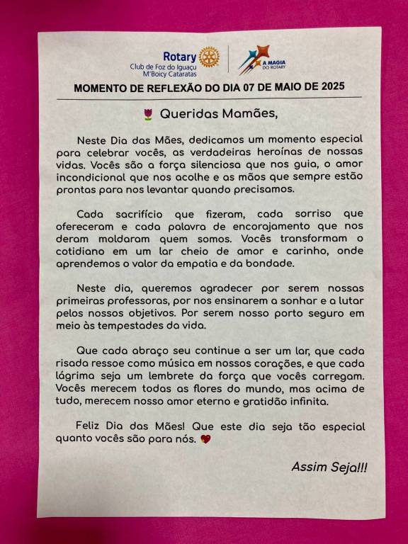 No dia 7 de maio, o Rotary Club de Foz do Iguaçu M’Boicy Cataratas realizou sua 40ª reunião ordinária da gestão 2024-2025. Conduzida pelo presidente Anderson e inspirada pelo lema “A Magia do Rotary”, a noite foi dedicada ao planejamento de iniciativas sociais e à celebração do Dia das Mães com momentos de profunda emoção.